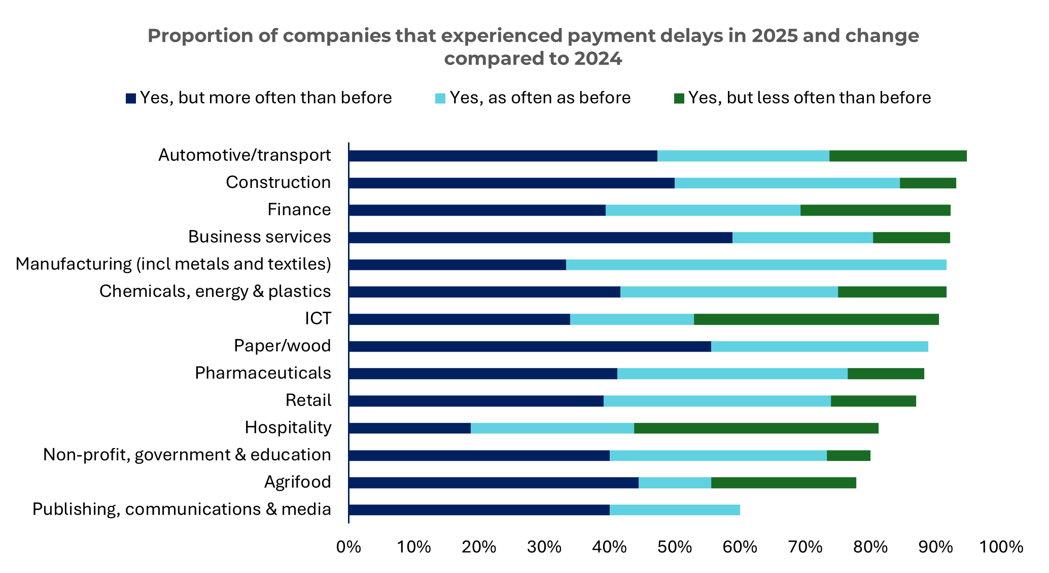 Sektory budownictwa oraz motoryzacyjny/transportowy są najbardziej dotknięte rosnącymi opóźnieniami w płatnościach (odpowiednio 95% i 93%), podczas gdy branże wydawnicza, komunikacyjna i medialna (60%), rolno-spożywcza (78%) oraz organizacje non-profit, sektor publiczny i edukacja (78%) zgłaszają mniej problemów. Często wynika to z dłuższych terminów płatności lub większej dyscypliny płatniczej po stronie kupujących