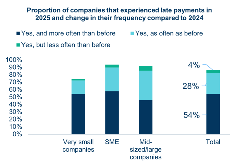 86% francuskich firm zgłasza, że w ciągu ostatnich 12 miesięcy doświadczyło opóźnień w płatnościach (w porównaniu do 82% w 2023 roku i 85% w 2024 roku). Zjawisko to dotyczy wszystkich sektorów, a szczególnie dużą grupę stanowią mikroprzedsiębiorstwa - ponad połowa z nich uważa obecnie wpływ opóźnień na płynność finansową za „krytyczny".