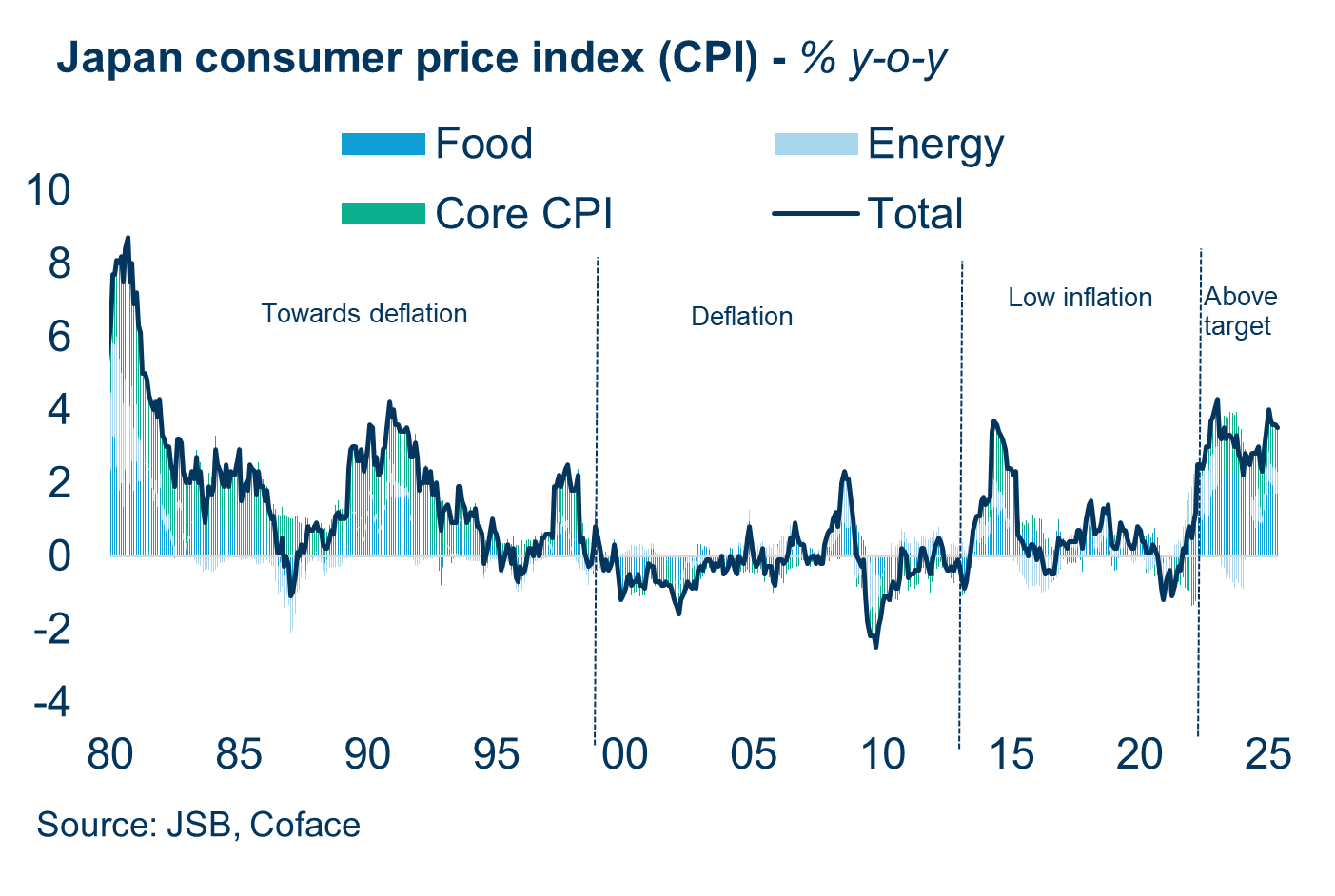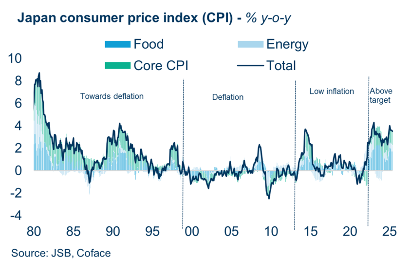 W ciągu ostatnich trzech dekad zdarzały się epizody inflacyjne, jednak były one głównie wynikiem przejściowych szoków, takich jak wzrost cen ropy czy podwyżki podatku konsumpcyjnego, bez trwałego wsparcia ze strony popytu krajowego. Sytuacja ta zmieniła się od 2022 roku, kiedy inflacja zaczęła konsekwentnie przekraczać cel 2% wyznaczony przez Bank Japonii, początkowo napędzana rosnącymi kosztami importu i osłabieniem jena.