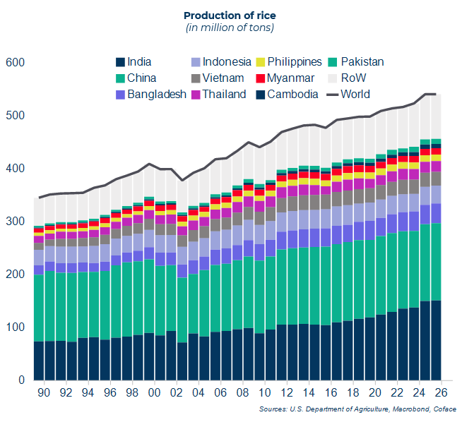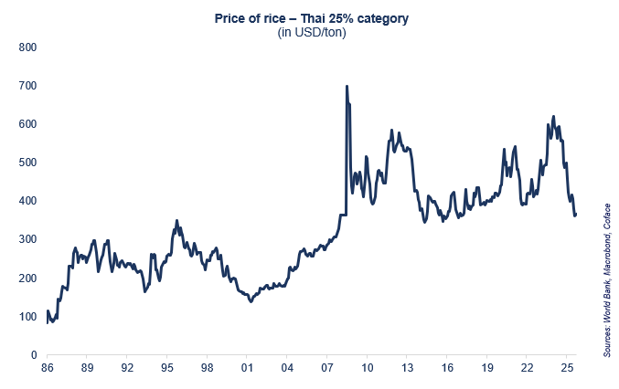 Od 2022 roku Indie, największy eksporter ryżu na świecie, ograniczały sprzedaż eksportową, aby powstrzymać wzrost cen na rynkach światowych (wzrost o 19% w latach 2022 i 2023), związany m.in. z wojną w Ukrainie oraz niekorzystnymi warunkami pogodowymi w Azji. Wznowienie eksportu w 2024 roku, w połączeniu z rekordowymi zbiorami w Azji, doprowadziło do 35% spadku cen w ciągu roku. Biorąc pod uwagę prognozy wzrostu produkcji na 2026 rok oraz możliwy powrót zjawiska La Niña w czwartym kwartale 2025 roku, przewidujemy rosnącą nadpodaż w 2026 roku. Oczekuje się, że ceny będą nadal spadać co najmniej do końca 2025 roku, a w 2026 roku prawdopodobnie się ustabilizują na poziomach niespotykanych od dekady.